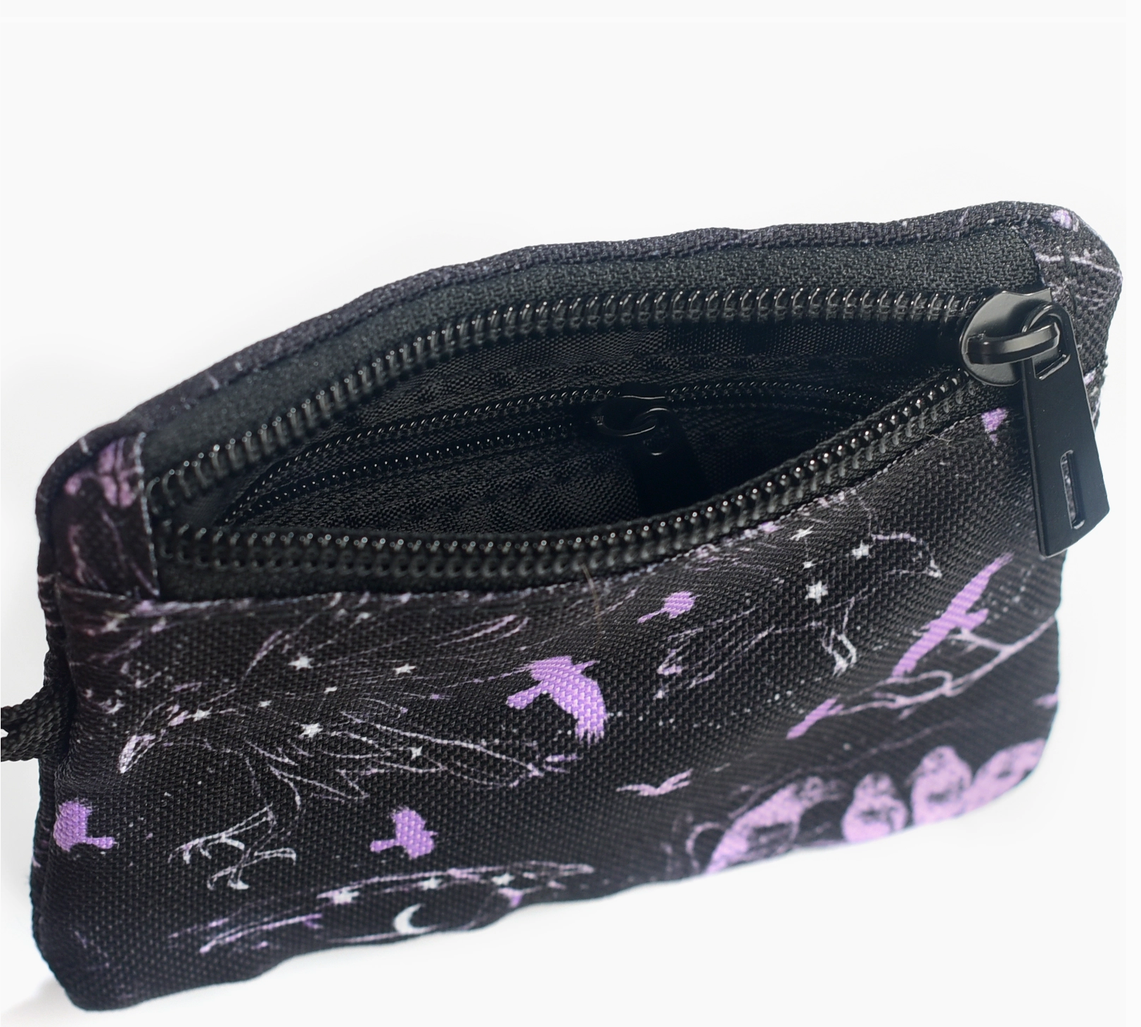 Cosmic Crows in lavender swirl, soar and perch with magical energy on a black background. This two-sided little wallet is just what you need to keep it light and carefree. Two zipper pockets on opposite sides to hold your change, cards or keys. There is also a small zipper pocket on the inside. The included S-Biner clip will make for quick clipping to a bag or your belt loop. Easily slips in your back or front pocket for fast access. -Wallet measures 4.5" x 3.25" (11.5 cm x 8 cm) -Made with recycled water-resistant polyester -Includes S-Biner clip