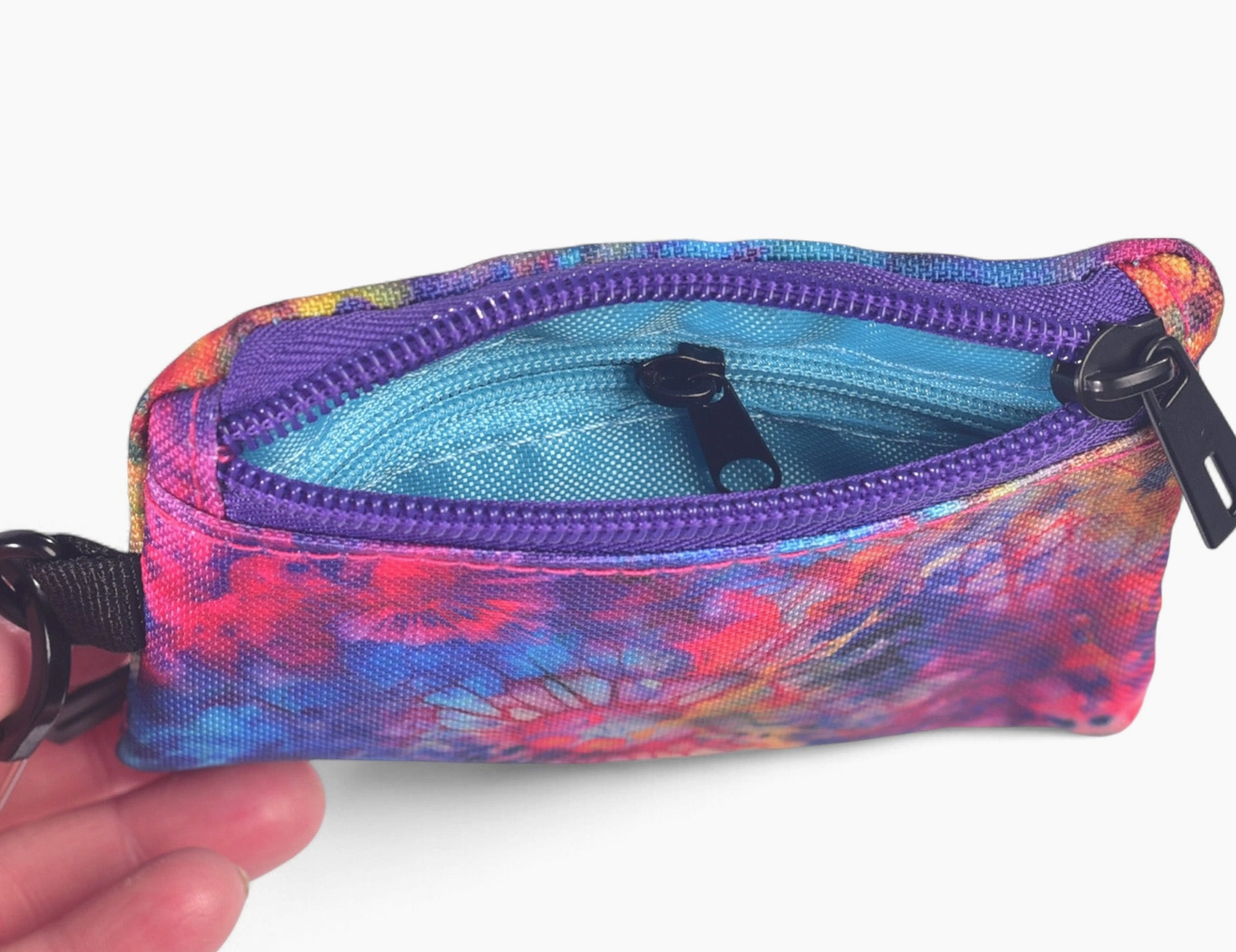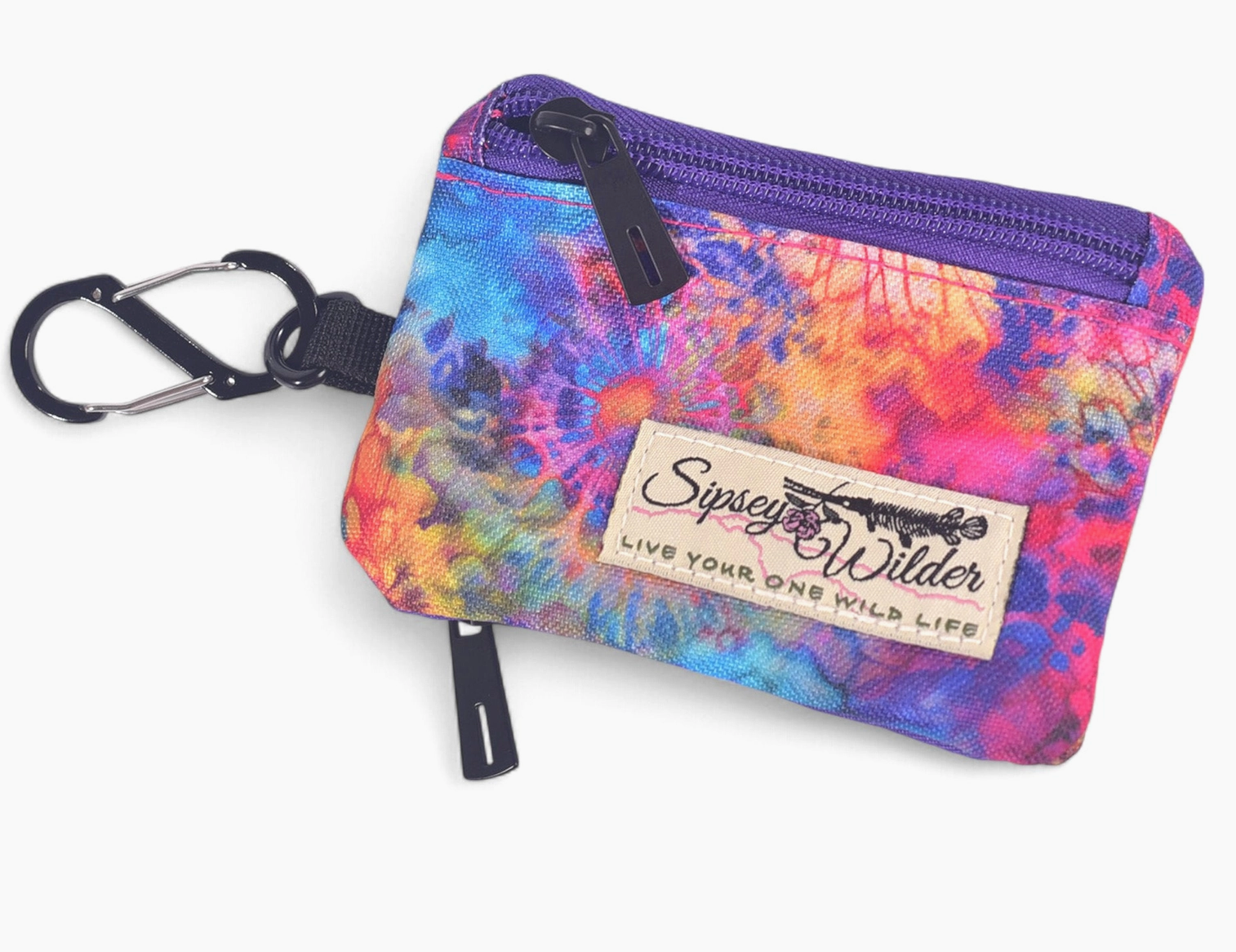 A rainbow burst of color with watercolor blooms and a bright aqua blue liner. This two-sided little wallet is just what you need to keep it light and carefree. Two zipper pockets on opposite sides to hold your change, cards or keys. There is also a small zipper pocket on the inside. The included S-Biner clip will make for quick clipping to a bag or your belt loop. Easily slips in your back or front pocket for fast access. -Wallet measures 4.5" x 3.25" (11.5 cm x 8 cm) -Made with 100% recycled polyester.💧♻️ -Includes S-Biner clip *Please note the placement of the fabric is unpredictable and random on each one. We can not guarantee the cut of the fabric received or take requests for specific pattern placement.