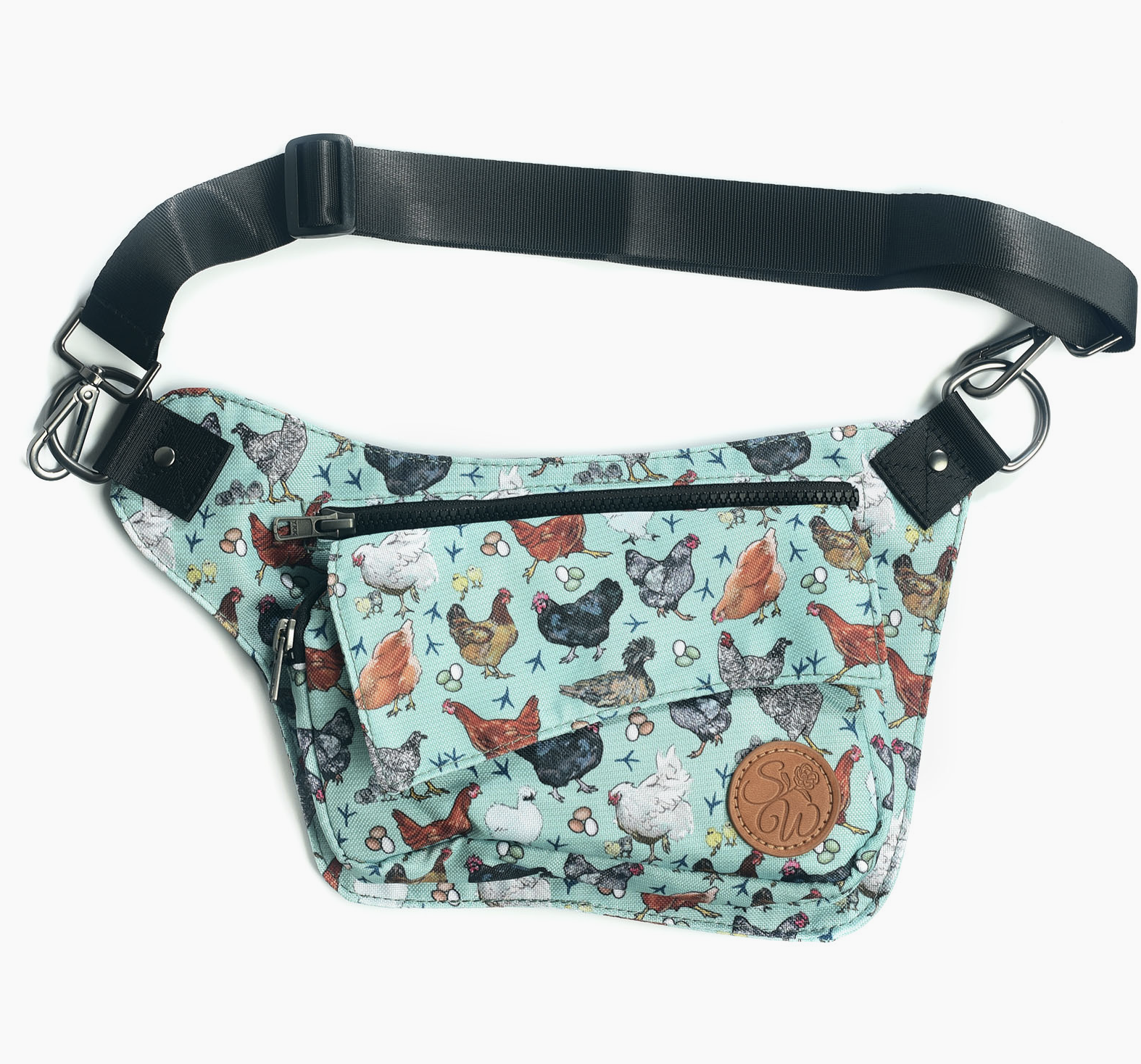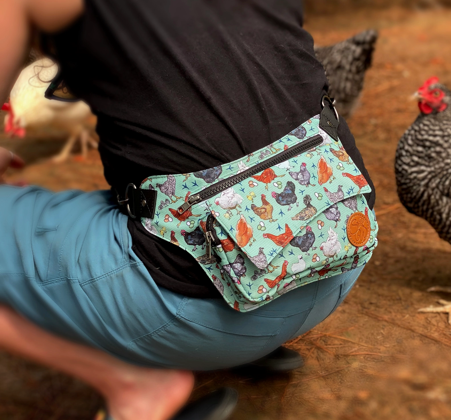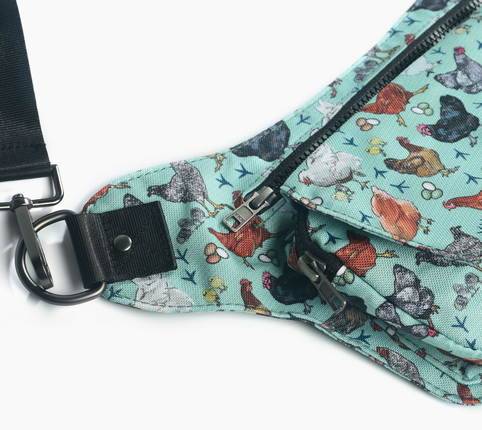 Welcome to the hen house! Featuring a variety of chicken breeds including the Silkie, Polish, Orpington, Barred Plymouth Rock,Australorp, Wyandotte, Red Broiler, Sussex, and White Plymouth Rock. These glorious hens, baby chicks, eggs and chicken tracks are pictured on a minty green-blue background. Our attractive hip hugging bag conforms to your body whether you wear it on your hip or as a chest bag. This versatile, original style keeps a slim profile and a sleek comfortable fit. *Now available in 3 strap size options! Size 2 is the most commonly ordered. Size 1 fits 28"-35" (XS-M) Size 2 fits 33"-46" (M-XL) Size 3 fits 44"-66" (XL-4XL) *Also works great for a crossbody strap! -Bag Measures 12" x 7.6" (30.5cm x 19.5cm) -The largest compartment measures 8" x 5.5 x 2" and the front compartment measures 8.25" x 4.75" -Made with 100% recycled water-resistant polyester. Metal hardware. Logo patch is made of vegan leather. *Pictured with a water bottle holder that is sold separately.