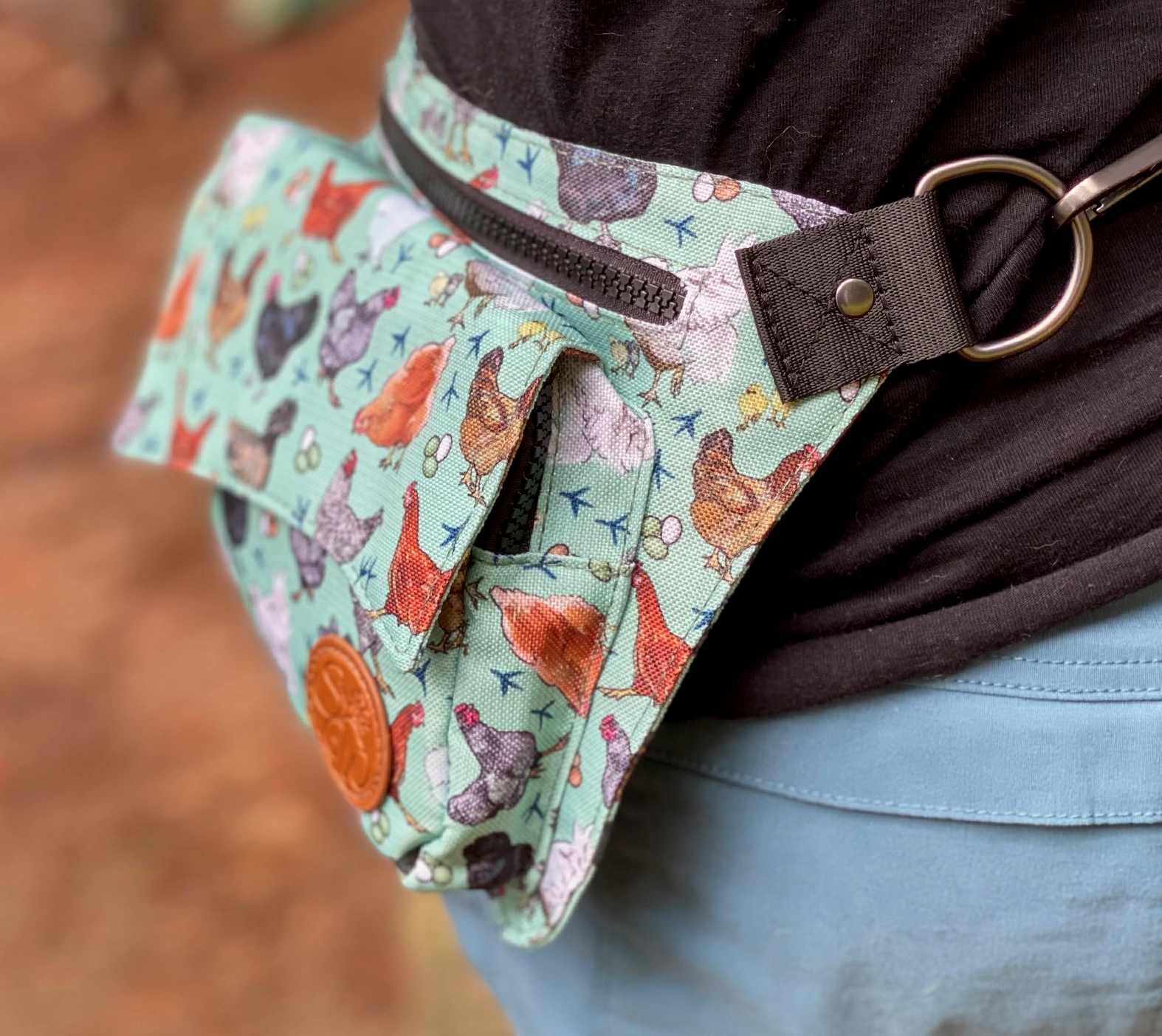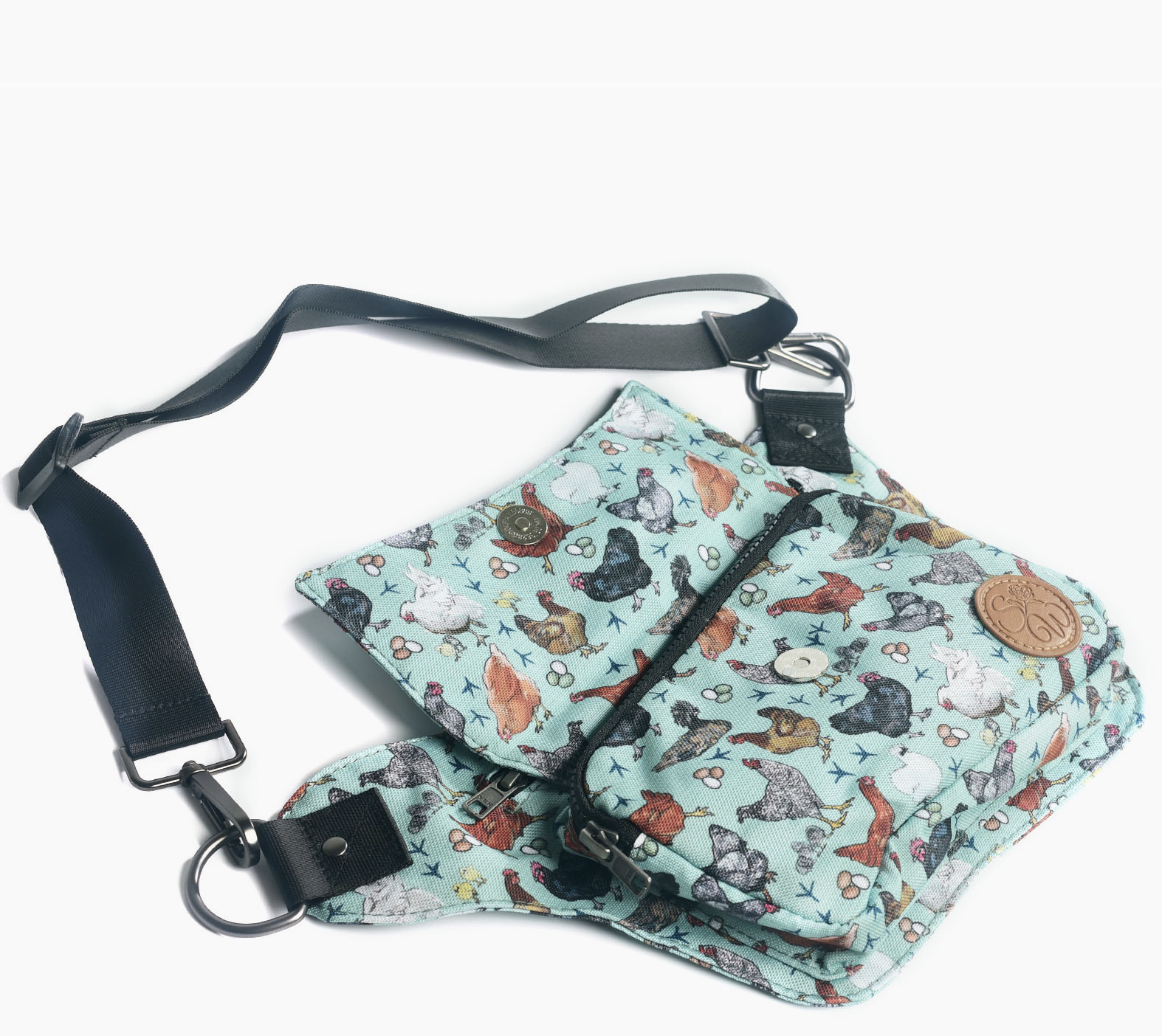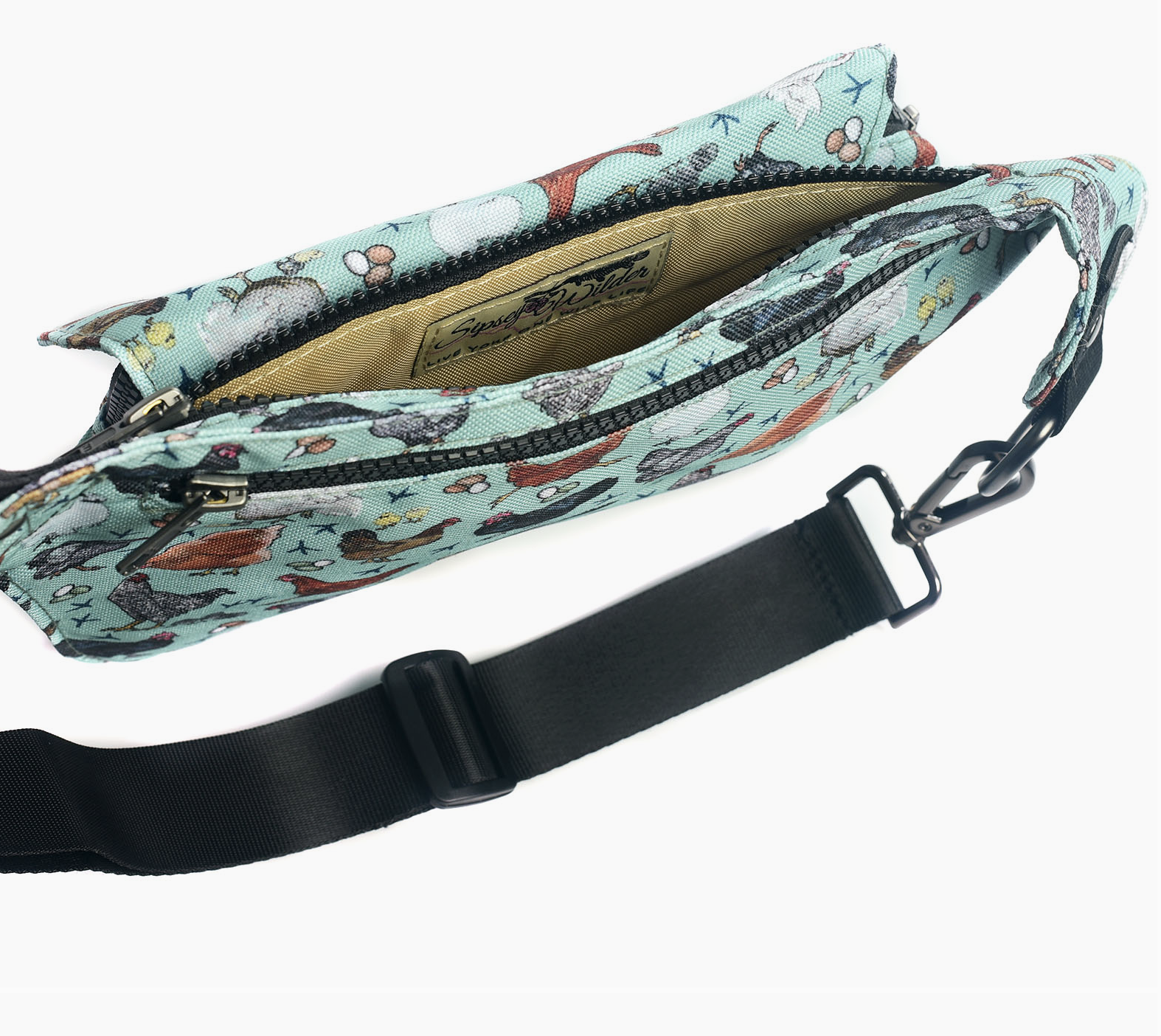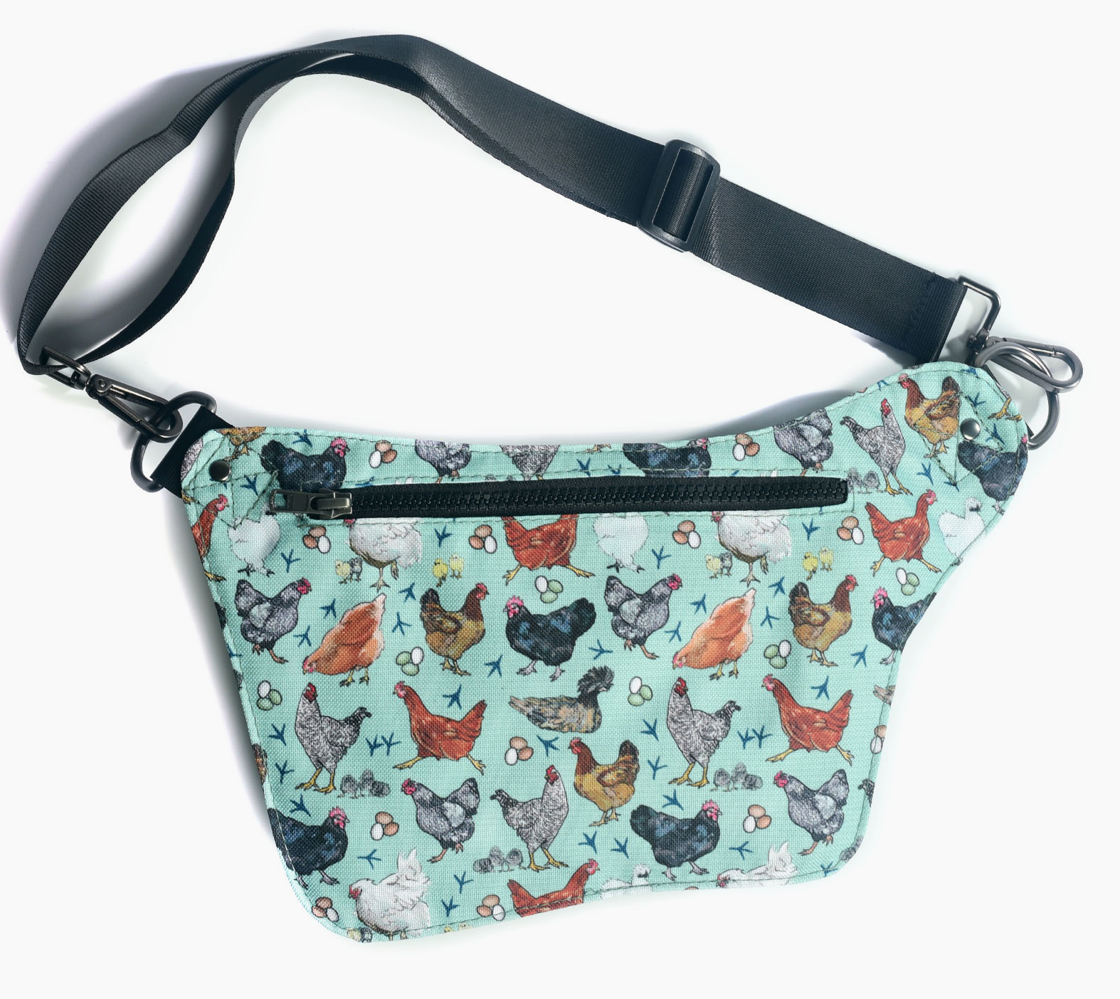Welcome to the hen house! Featuring a variety of chicken breeds including the Silkie, Polish, Orpington, Barred Plymouth Rock,Australorp, Wyandotte, Red Broiler, Sussex, and White Plymouth Rock. These glorious hens, baby chicks, eggs and chicken tracks are pictured on a minty green-blue background. Our attractive hip hugging bag conforms to your body whether you wear it on your hip or as a chest bag. This versatile, original style keeps a slim profile and a sleek comfortable fit. *Now available in 3 strap size options! Size 2 is the most commonly ordered. Size 1 fits 28"-35" (XS-M) Size 2 fits 33"-46" (M-XL) Size 3 fits 44"-66" (XL-4XL) *Also works great for a crossbody strap! -Bag Measures 12" x 7.6" (30.5cm x 19.5cm) -The largest compartment measures 8" x 5.5 x 2" and the front compartment measures 8.25" x 4.75" -Made with 100% recycled water-resistant polyester. Metal hardware. Logo patch is made of vegan leather. *Pictured with a water bottle holder that is sold separately.